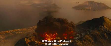 phoenix-like rise from a lava-spewing volcano precedes his soaring over