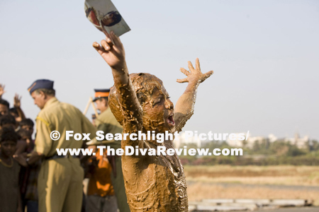 DP: Yeah, it took me ages to learn. I was walking around on set every day doing it, getting everybody annoyed. But there’s one scene right at the end when I run across the platform when I finally see her {Latika} and we hold hand and I kiss her scar. And running across the platform, I stepped on a massive stone and twisted my ankle and it turned into an elephant foot after dancing on it for 3 days at VT. It got so bad that they had to cut my shoe open so my foot would fit in. And when you’re dancing, Danny was like, “Sell it, sell it,” cos you’ve really gotta sell it with your mouth when you’re dancing with all the smiles and stuff. Then the torture scene was after that. I was up there hanging and all the blood started to pool in this one leg and it started to get bigger and bigger, so they had trouble filming my feet, cos it was too graphic to film my face getting electrocuted, so they decided to have my feet shaking. But I really got into it; we had to tone a lot of it down. I mean, I know it sounds weird, but there’s a fine line between making getting electrocuted funny and making it serious. I mean I was practicing it all day in the hotel like “Zzzz-zzz-zzzz-zzz.” It kept on turning out funny, but then when I was with Irfan and Saurabh {Shukla} in this sweaty environment and they take their job deadly seriously, I felt it, you know? I did have to hang for a bit of the time. I thought I would be macho and try some chin-ups before it and Danny’s like, “This is gonna really hurt. Your arms could pull out of your socket.” And I was like, “No problem, I’m a Taekwando champion.” And then I tred to do a chin-up and I was like “God, this is really hard.”