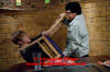 boy in a chair tied to Chan's back.